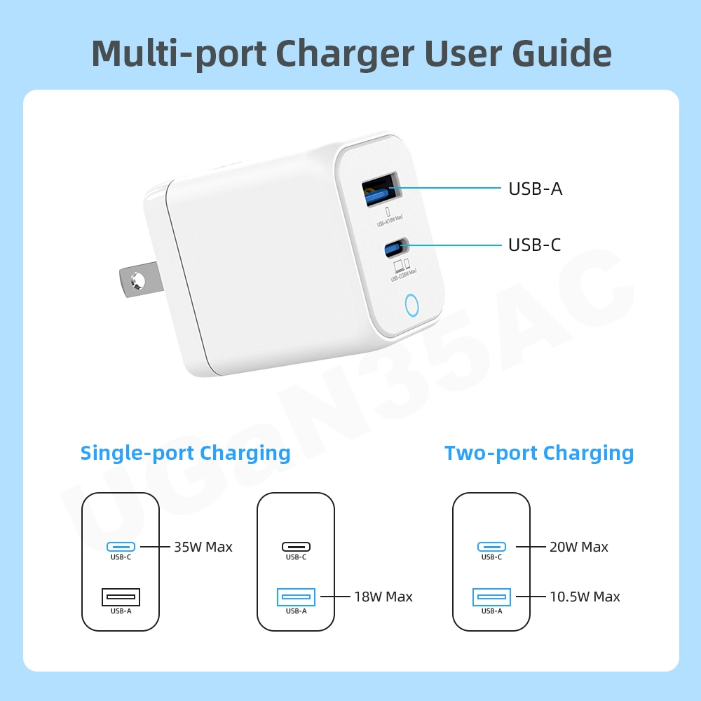 - What you get: 1 unit of 35W 2-port universal charger, welcome guide, 12-month warranty, and friendly customer service
