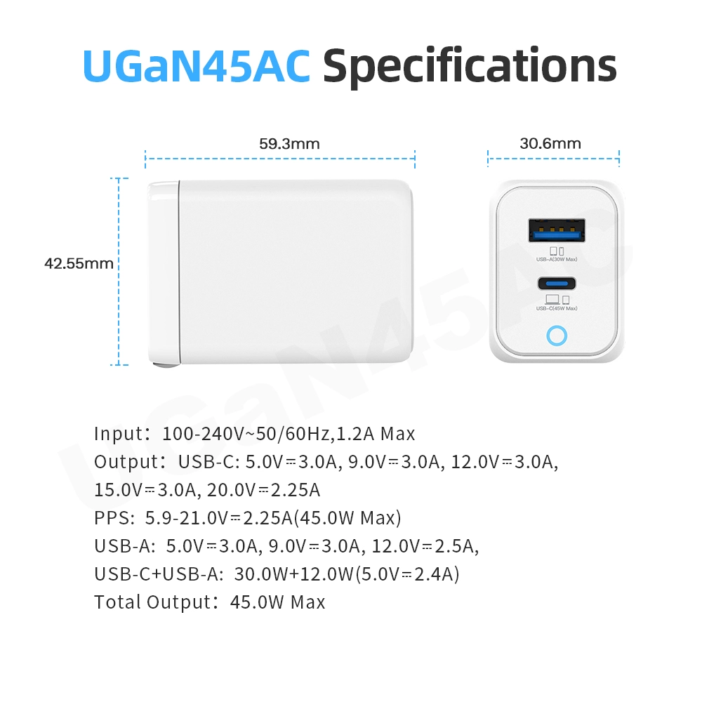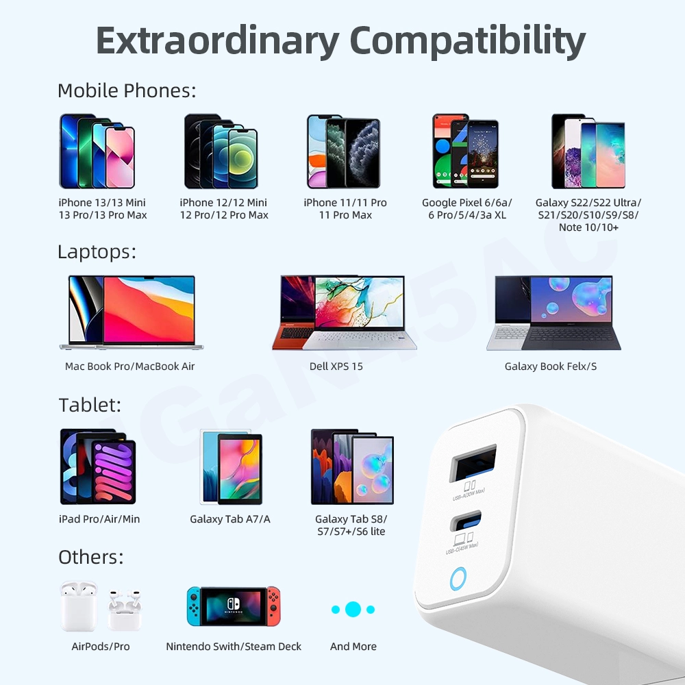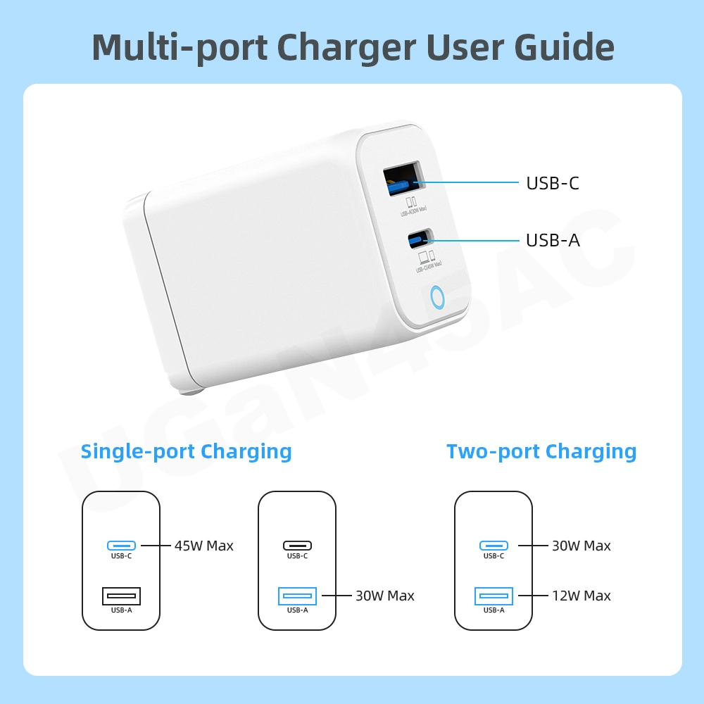 - What you get: 1 unit of 45W 2-port universal charger, welcome guide, 12-month warranty, and friendly customer service